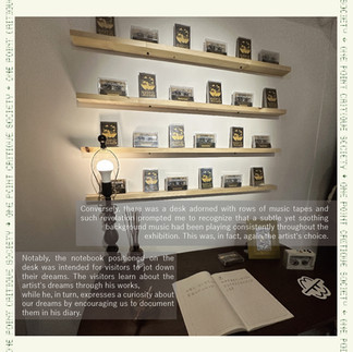 Speaking of the thematic divisions, I must say, the exhibition design is brilliantly fun and creative. The artist deliberately selected a lifelike and serene setting of a bedroom to correspond with his theme of lucid dreaming, considering his substantial time spent in bed as the primary wellspring of inspiration for his artistic creations. This arrangement invited visitors to not only figuratively step into the artist's shoes but, quite literally, step into the artist's bed, thereby immersing themselves in his unique perspective. Conversely, there was a desk adorned with rows of music tapes and such revelation prompted me to recognize that a subtle yet soothing background music had been playing consistently throughout the exhibition. This was, in fact, again the artist's choice. This links back to how it’s offering the visitors a closer glimpse of who he is—highlighting his aesthetic inclinations and emphasizing his sincerity in preparing an immersive experience for the audience, ultimately enhancing his brand as an artist. Notably, the notebook positioned on the desk was intended for visitors to jot down their dreams. The visitors learn about the artist's dreams through his works, while he, in turn, expresses a curiosity about our dreams by encouraging us to document them in his diary. To me, it almost feels like I am having a friendly conversation with the artist and it hugely enhances my sense of connection with the artist.