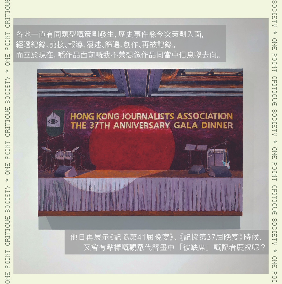 當然,無人會要求畫廊「包生仔」,將呢批作品護送到藝術館,用新聞嘅標準留底,送到每個喺未來嘅香港人。各地一直有同類型嘅策劃發生,歷史事件喺今次策劃入面,經過紀錄、剪接、報導、覆述、篩選、創作、再被記錄。而立於現在,喺作品面前嘅我不禁想像作品同當中信息嘅去向。被畫框斬開咗嘅《國家元首 I》同《國家元首 II》會唔會分別比人收藏喺兩個更遠嘅地方呢?他日再展示《記協第41屆晚宴》、《記協第37屆晚宴》嘅時候,又會有點樣嘅觀眾代替畫中「被缺席」嘅記者慶祝呢?